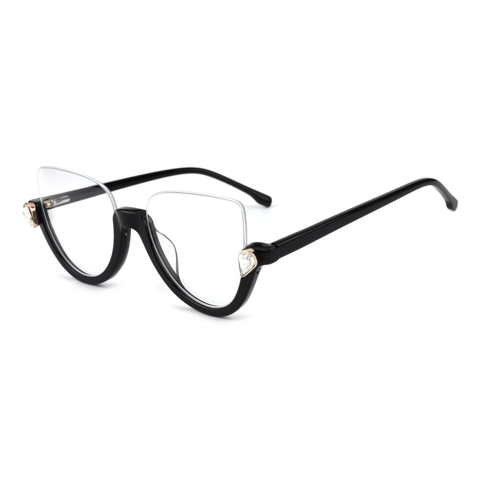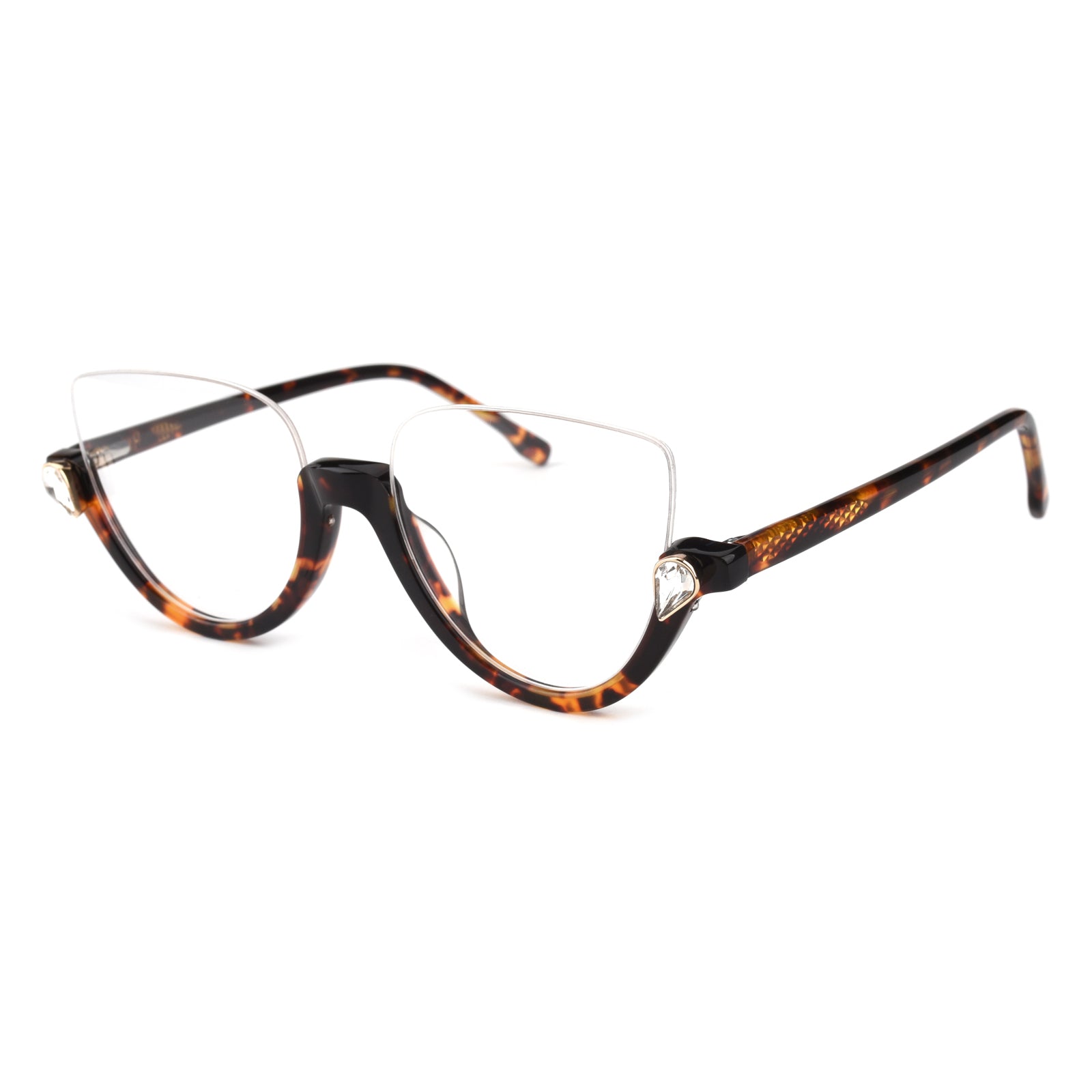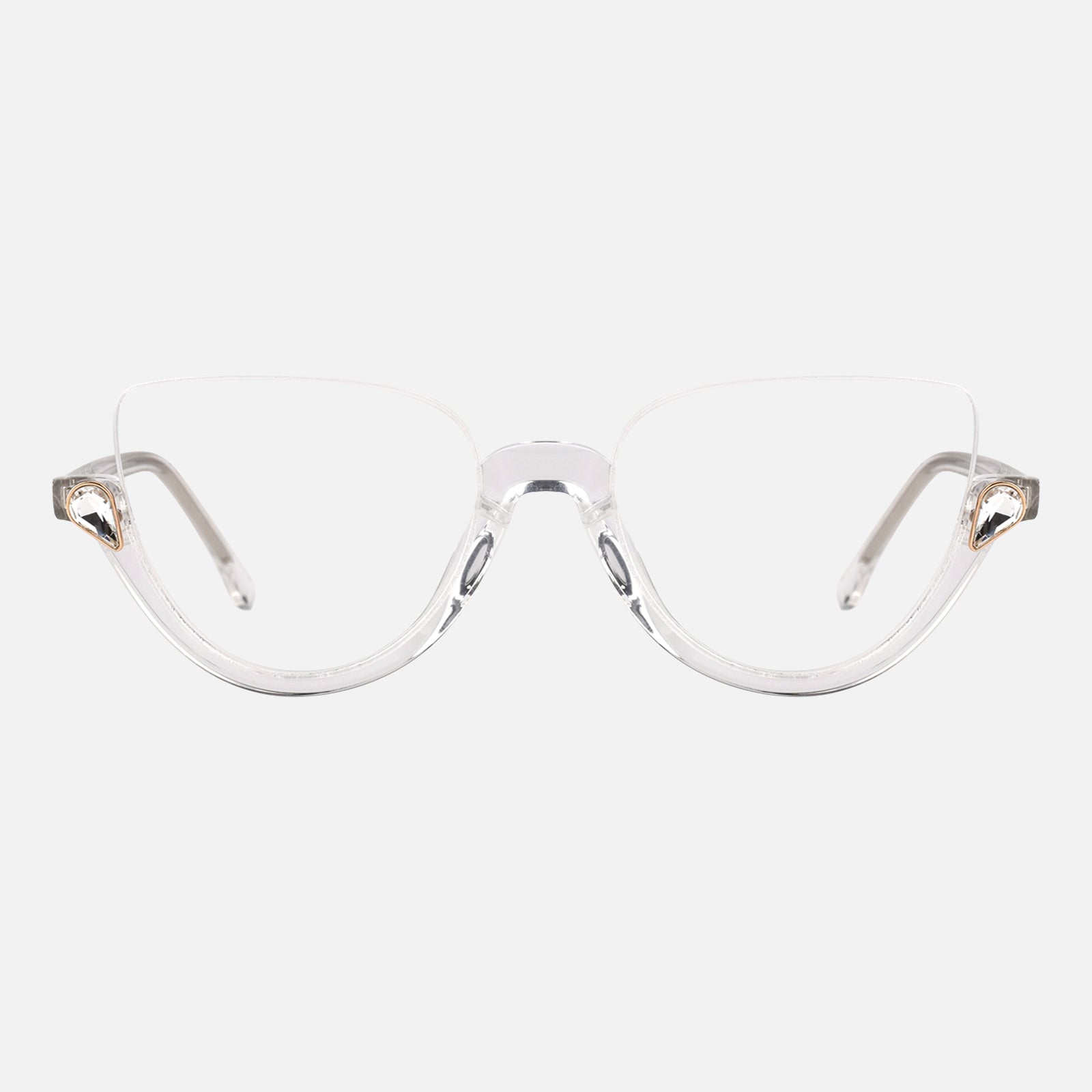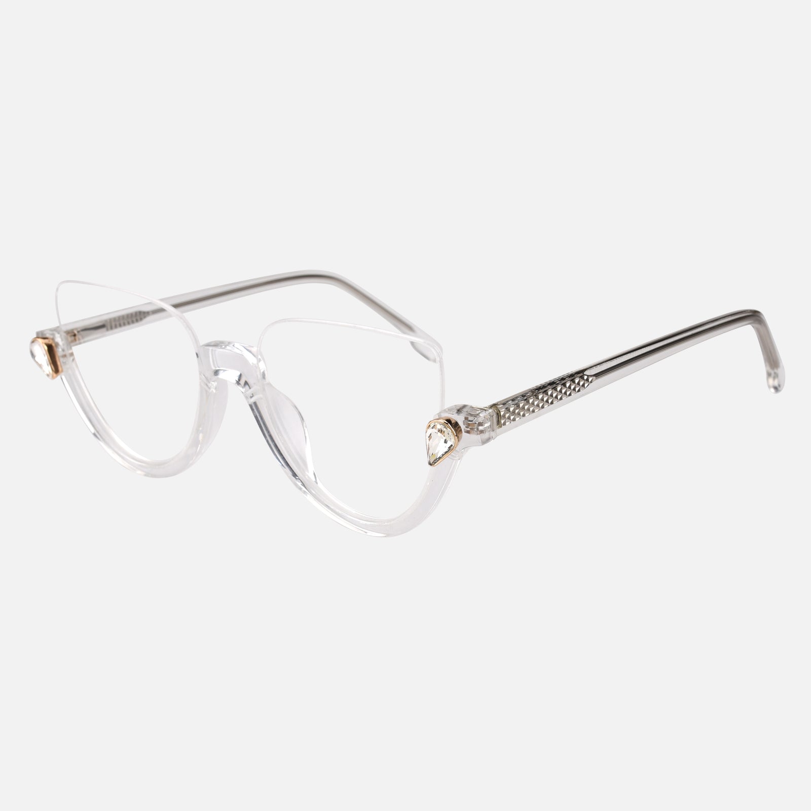 This semi-rimless cat-eye frame features teardrop-shaped rhinestone embellishments on both sides. making it perfect for after-party events. Available in tortoiseshell and transparent colors.