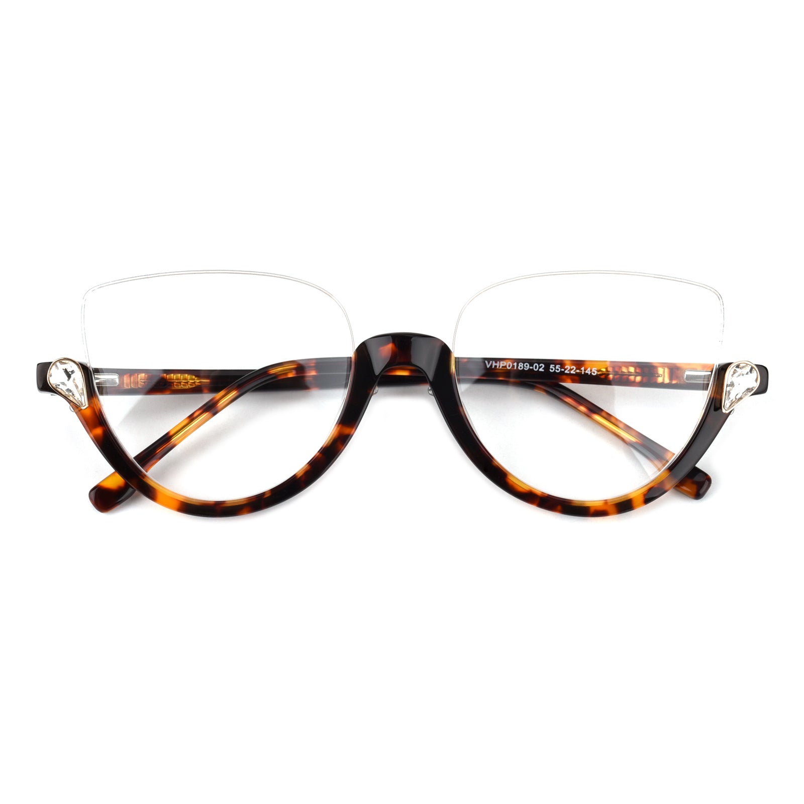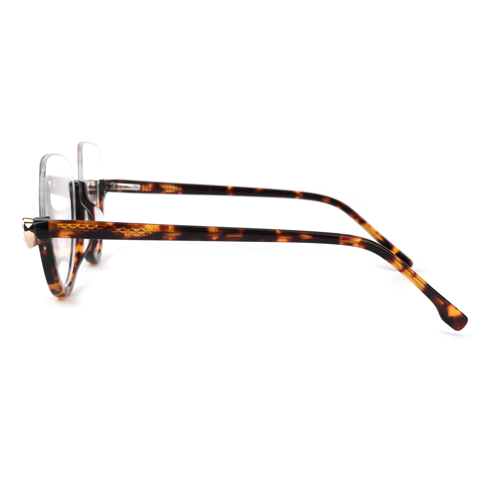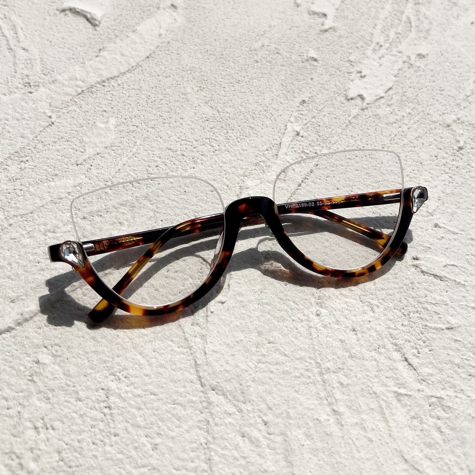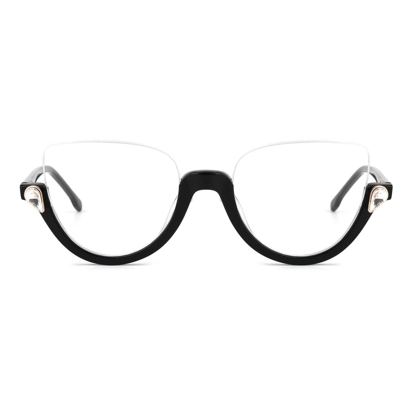 This semi-rimless cat-eye frame features teardrop-shaped rhinestone embellishments on both sides. making it perfect for after-party events. Available in tortoiseshell and transparent colors.