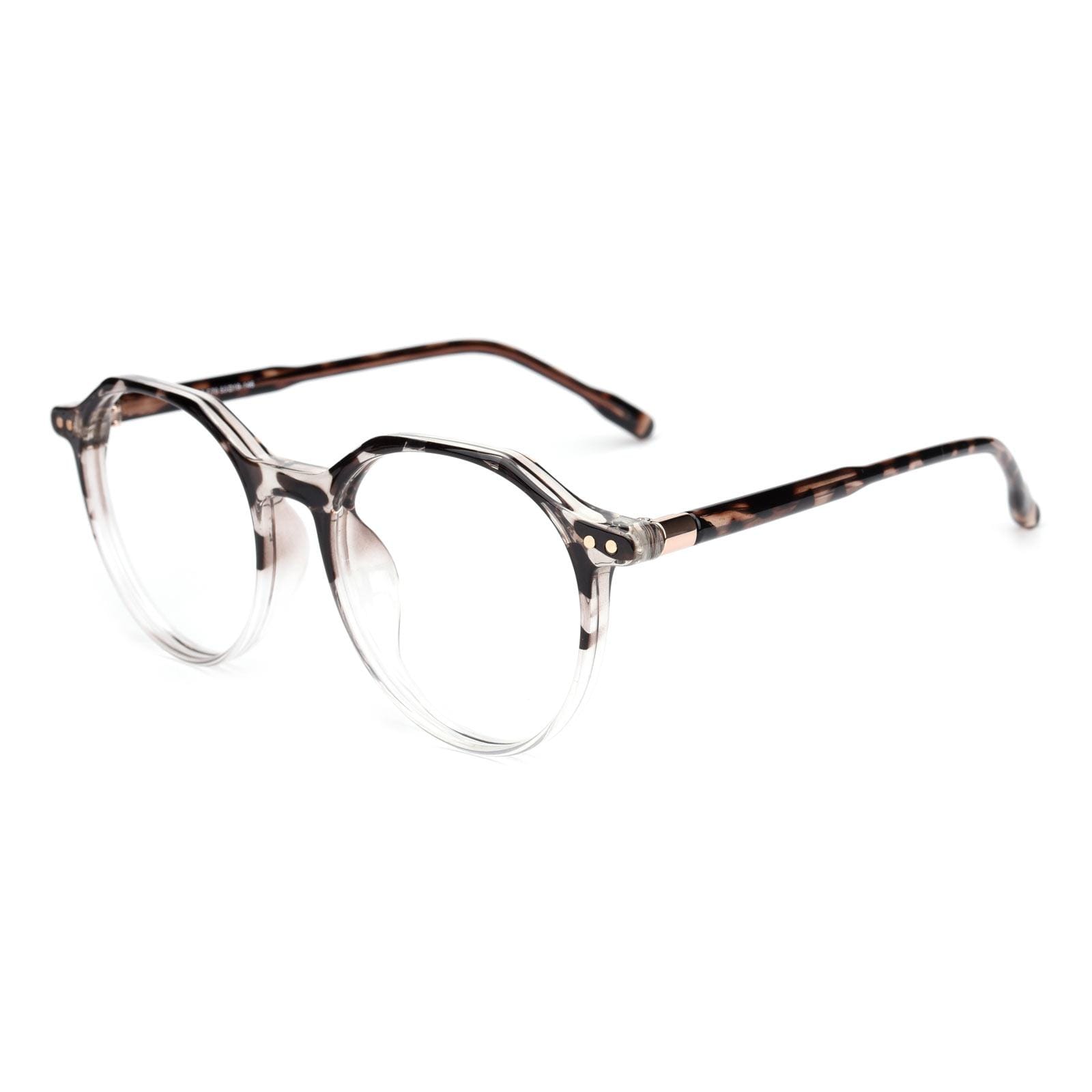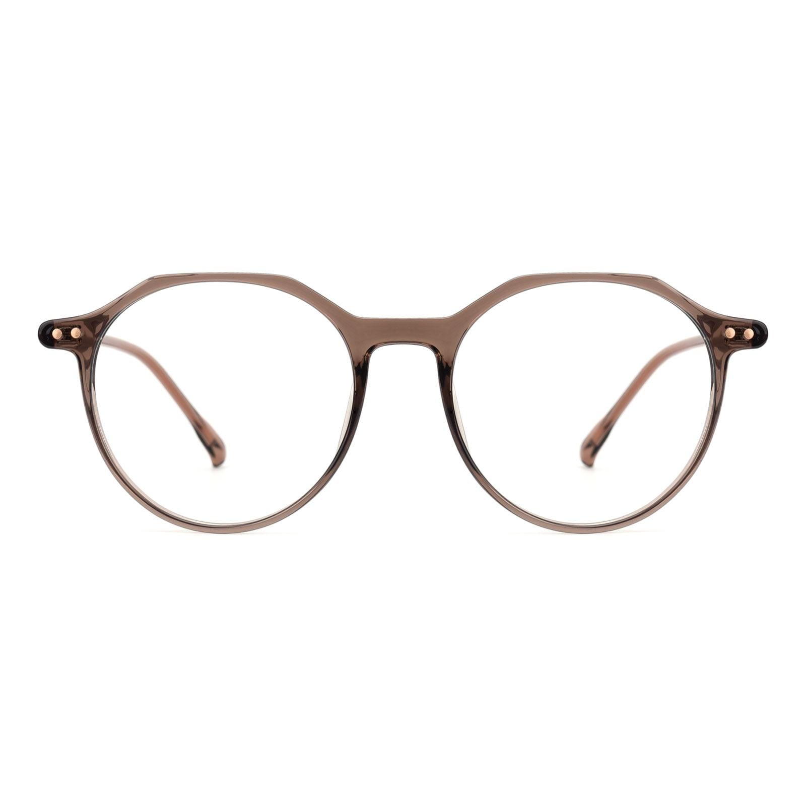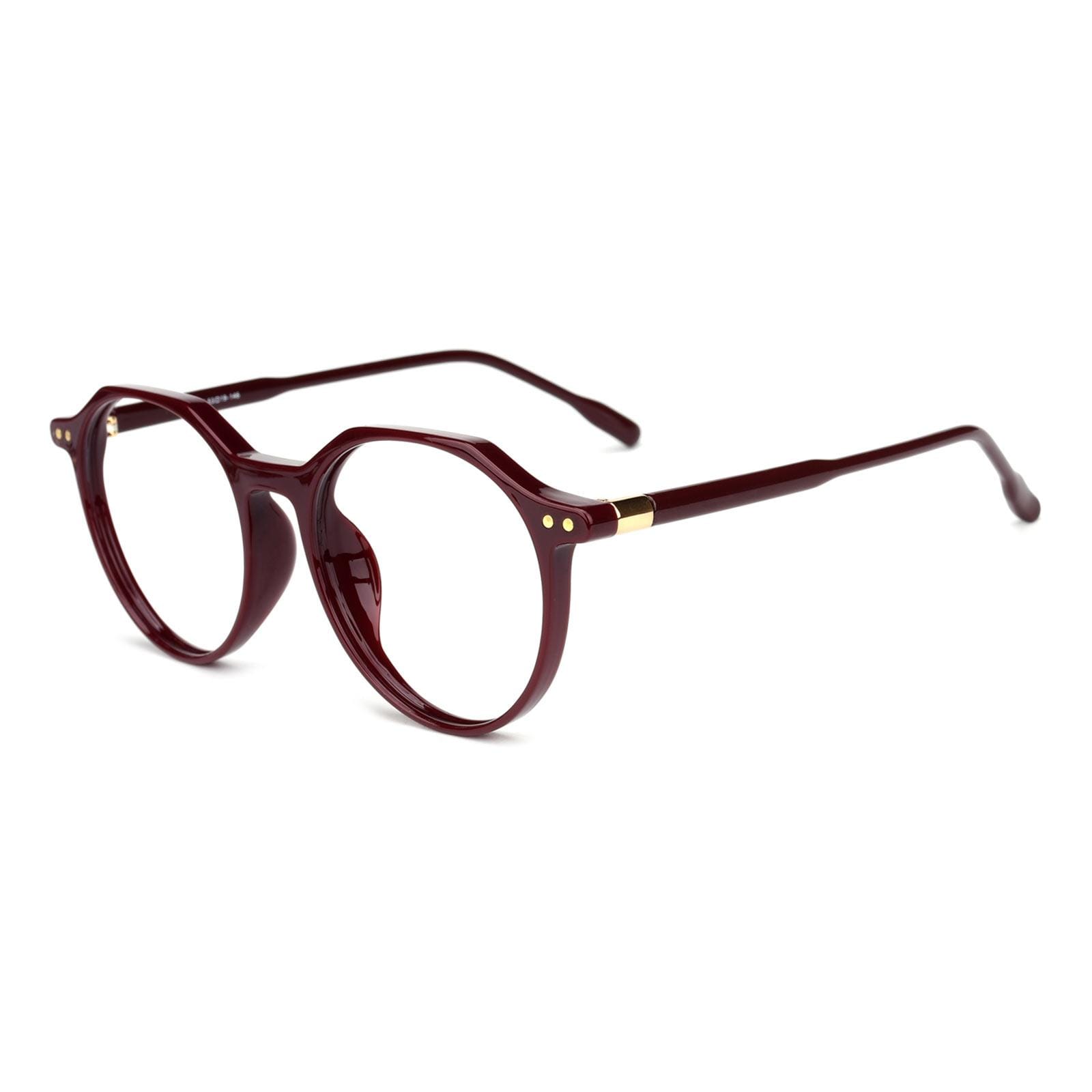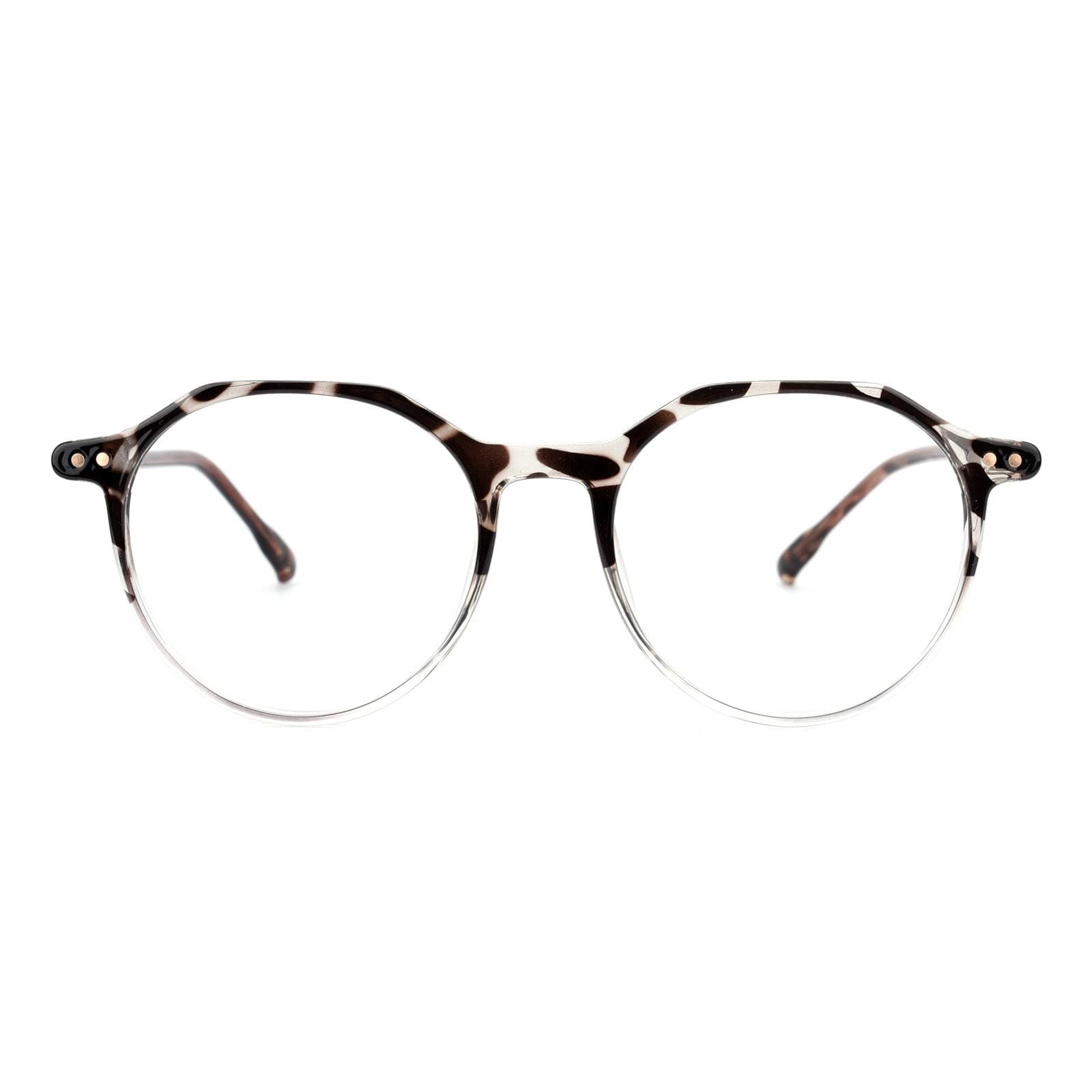 New polygonal round frame glasses designed by Eye City designers. Ideal for everyday wear. Available in four colors. coffee brown. dark red. black & white leopard print and clear.