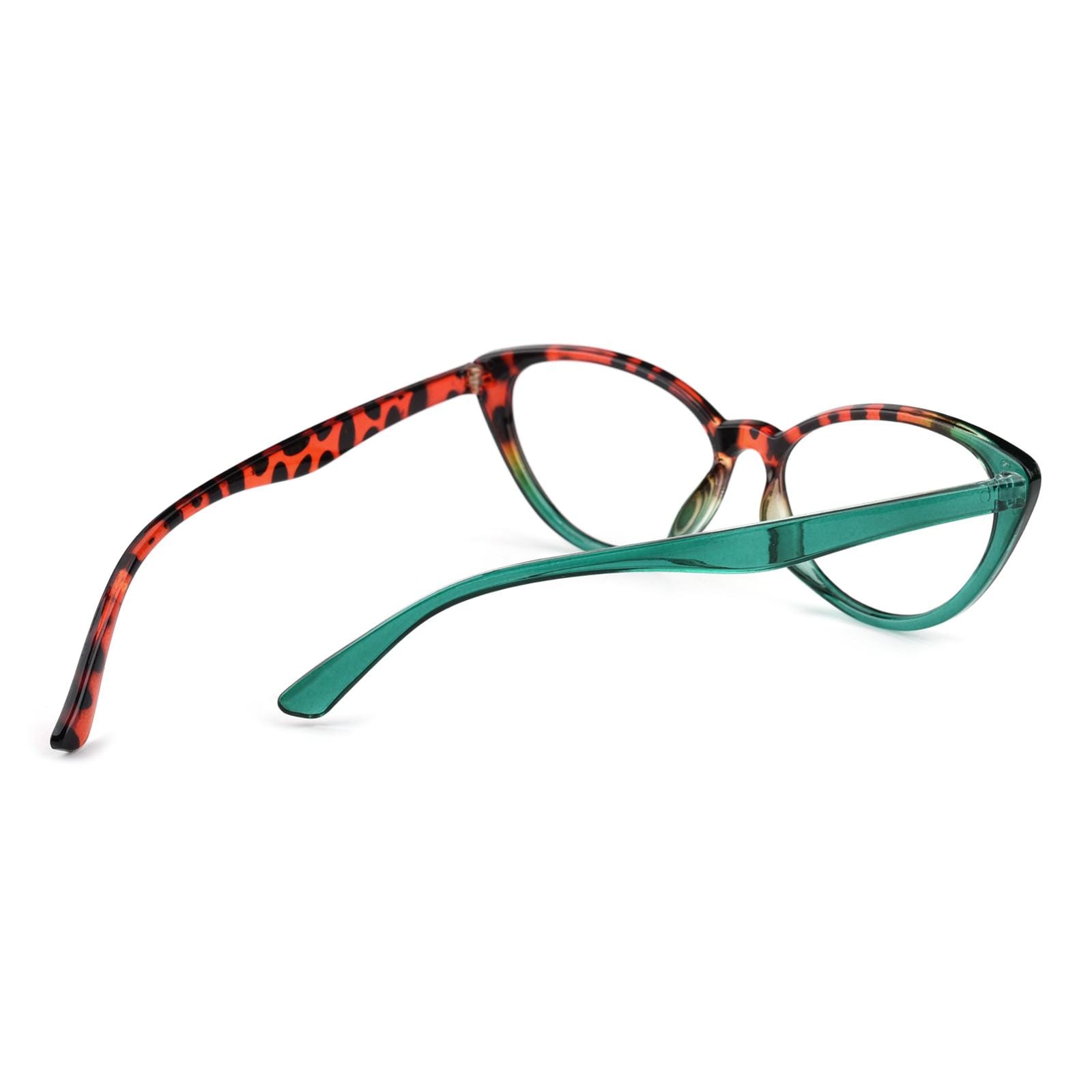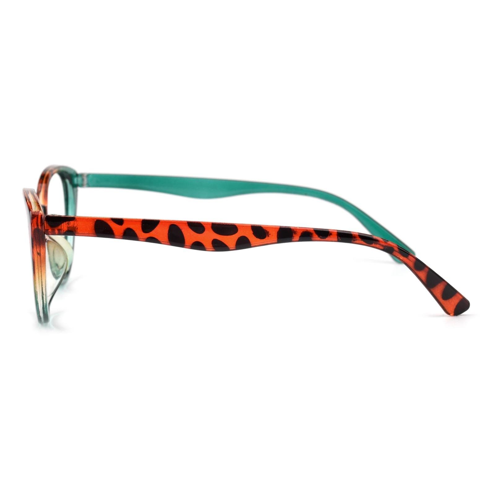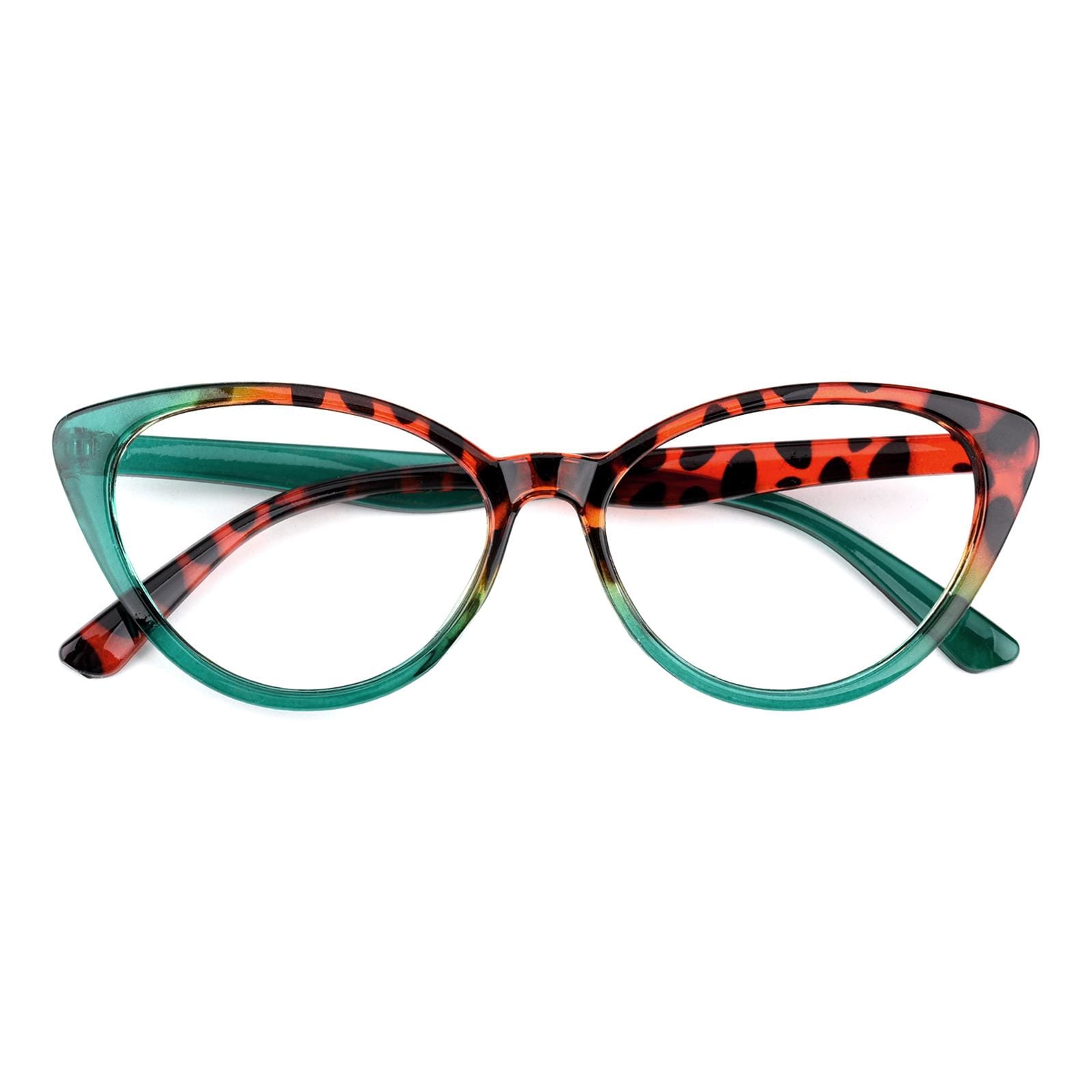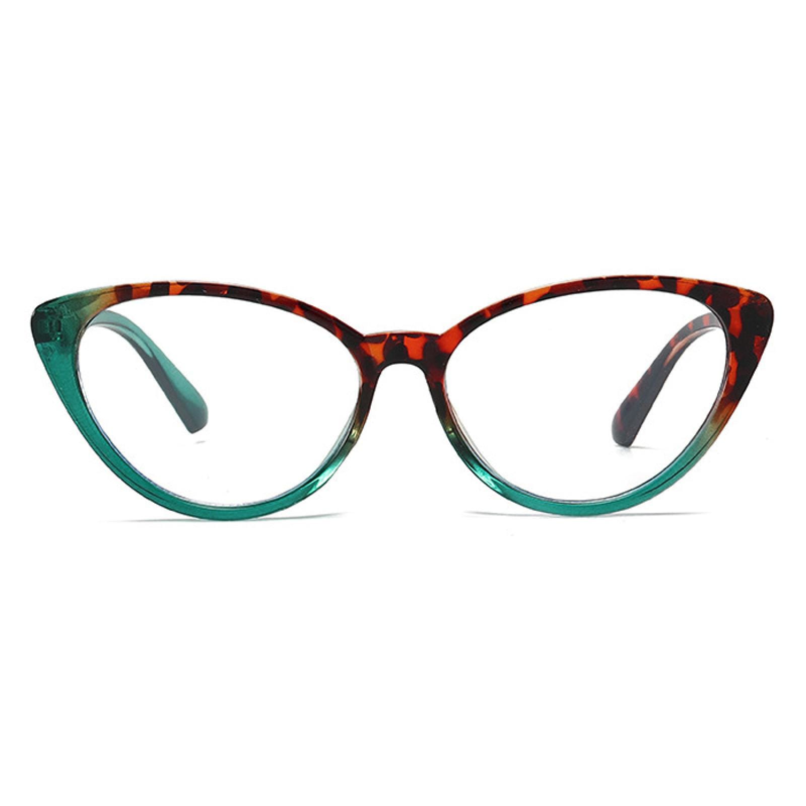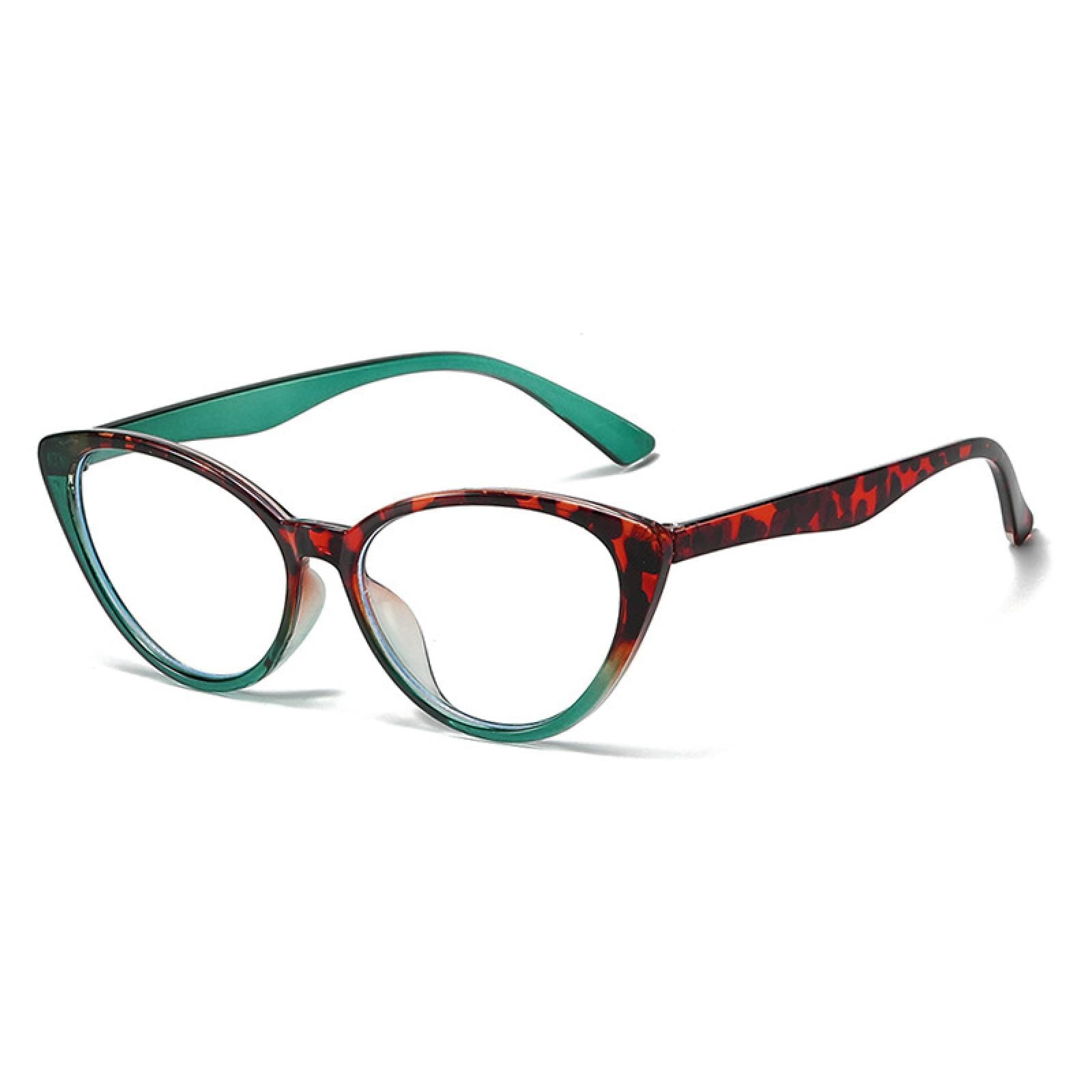 Crafted from lightweight plastic. these frames. at just 13g. guarantee comfort during extended wear. The unique fusion of green and leopard patterns adds a touch of nature-inspired charm. while the cateye shape infuses a vintage allure with modern sophistication. Whether it's work or leisure. 'Clara' promises a stylish and comfortable companion for any occasion.