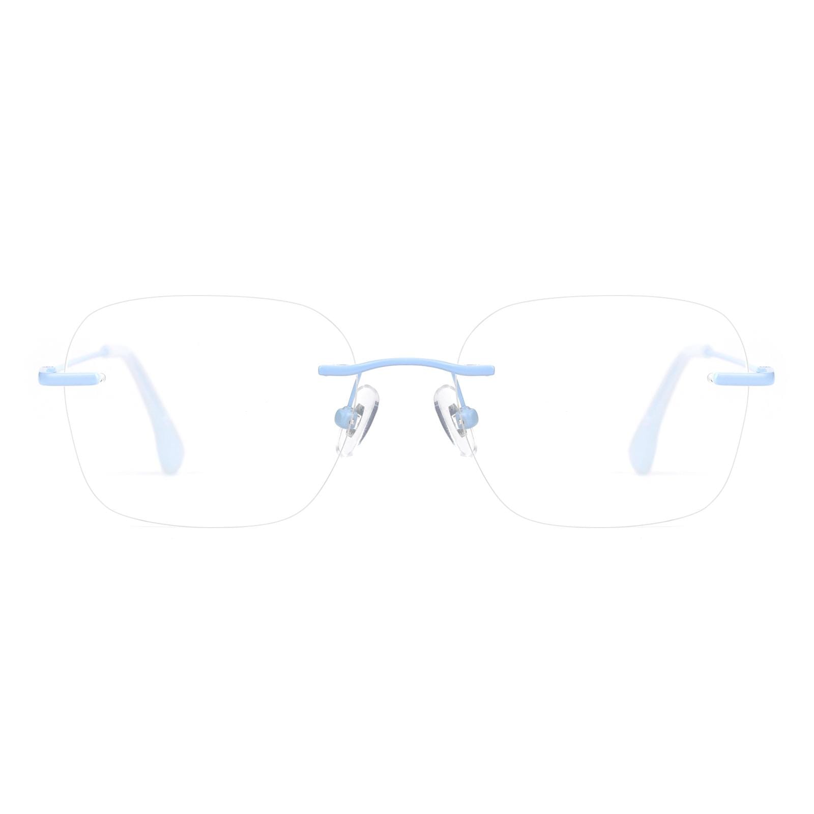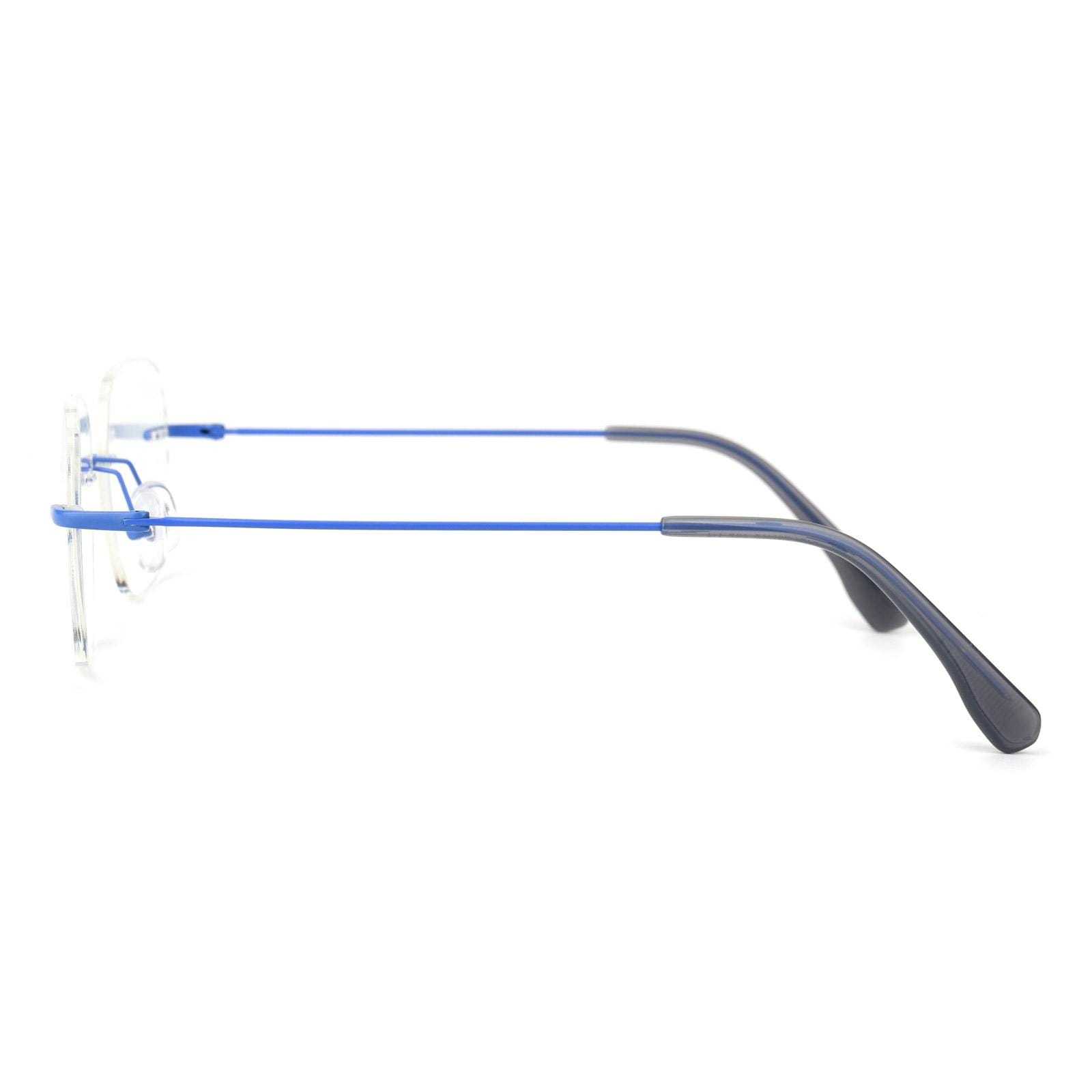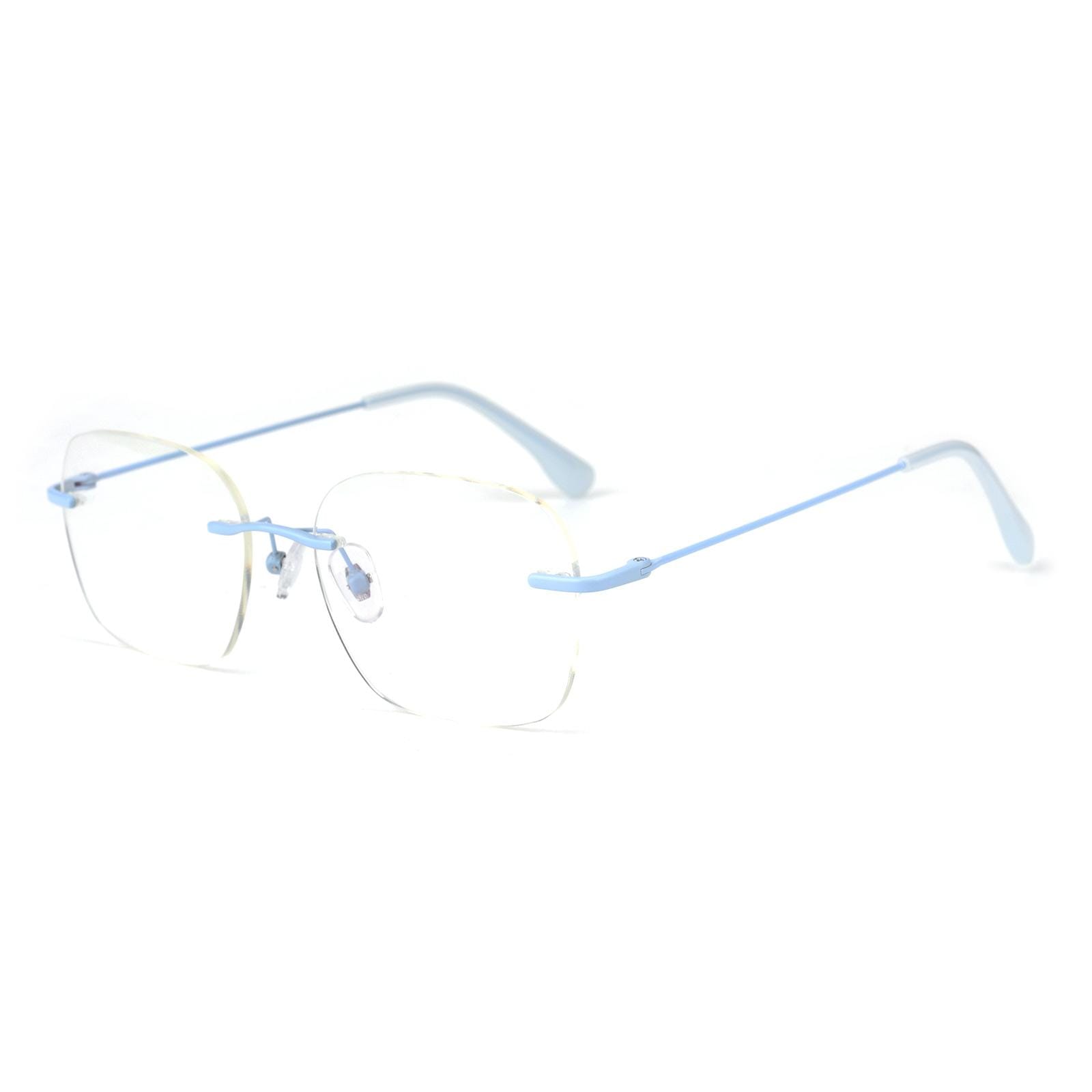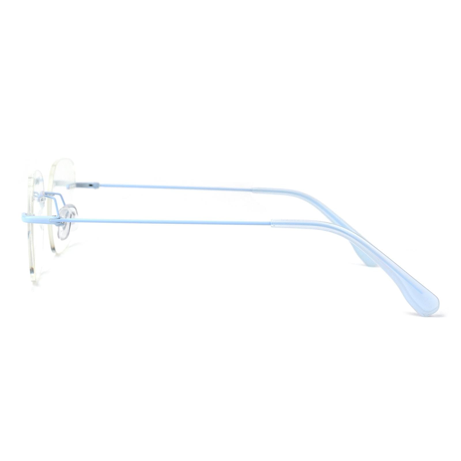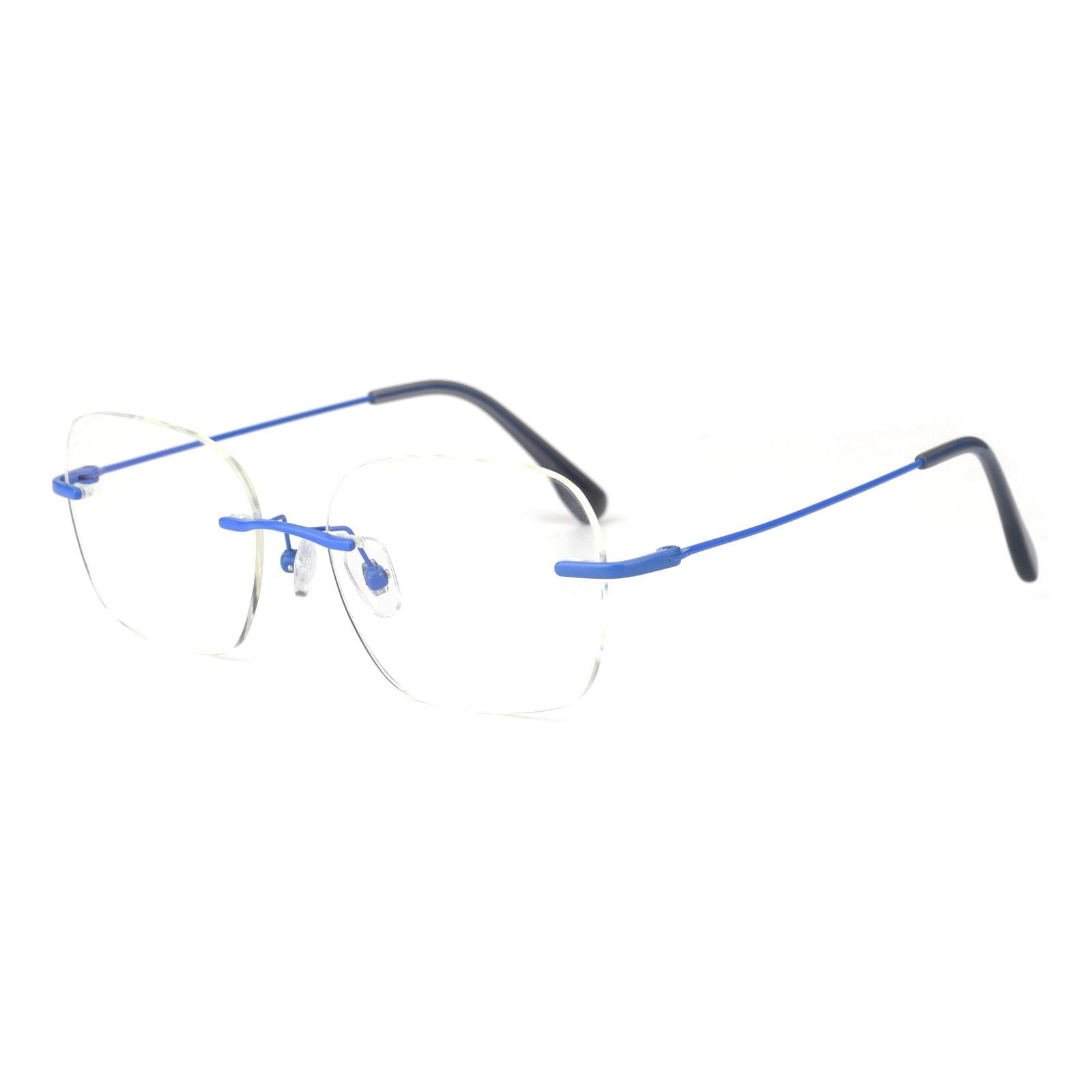 Introducing our sleek and modern frameless eyeglasses with a touch of sophistication! The rimless design gives you a clean and minimalistic look. perfect for those who appreciate simplicity and style. The metal legs are coated in a stunning matte blue finish. adding a touch of elegance to your eyewear collection. These eyeglasses are not only fashionable. but also lightweight and comfortable to wear. The frameless design provides an unobstructed field of vision. making them ideal for everyday use. Elevate your style with our frameless eyeglasses featuring exquisite matte blue metal legs!