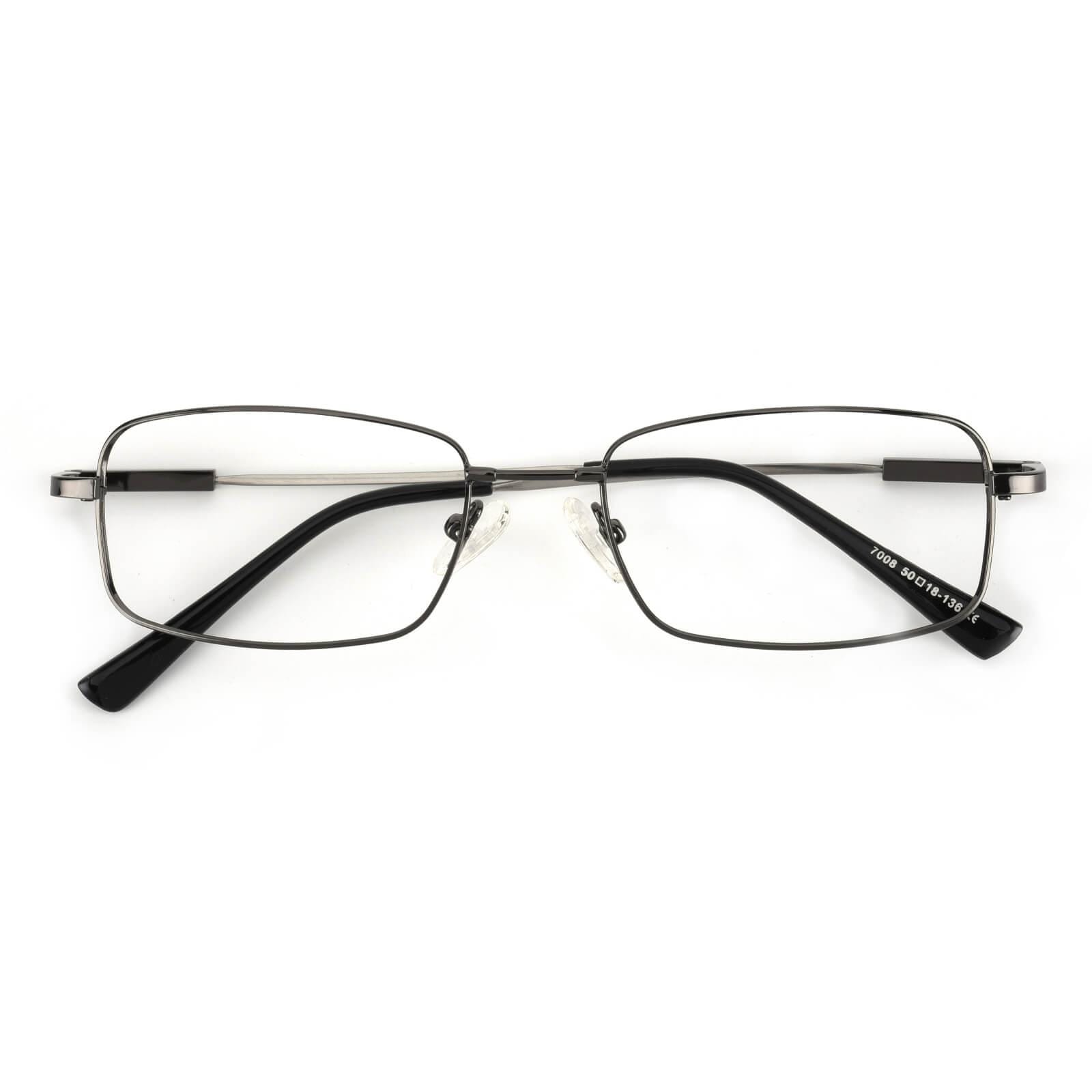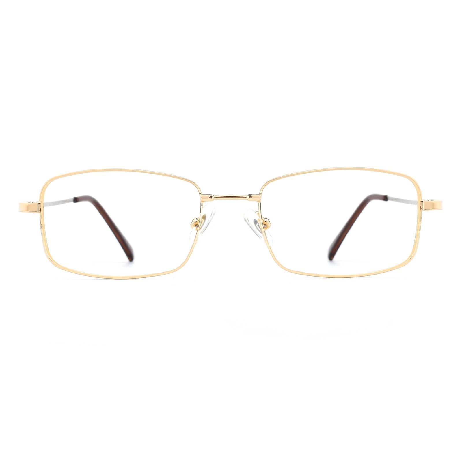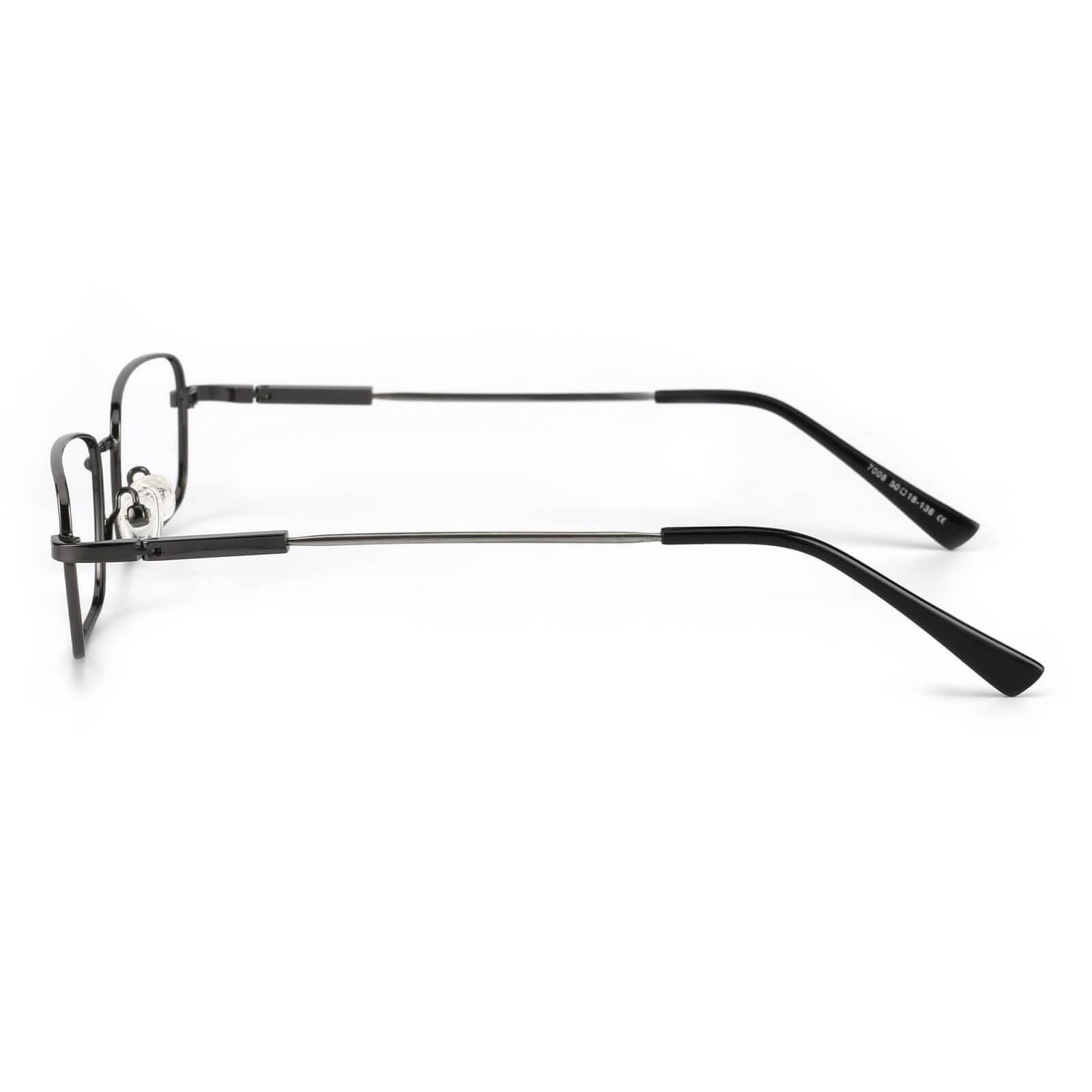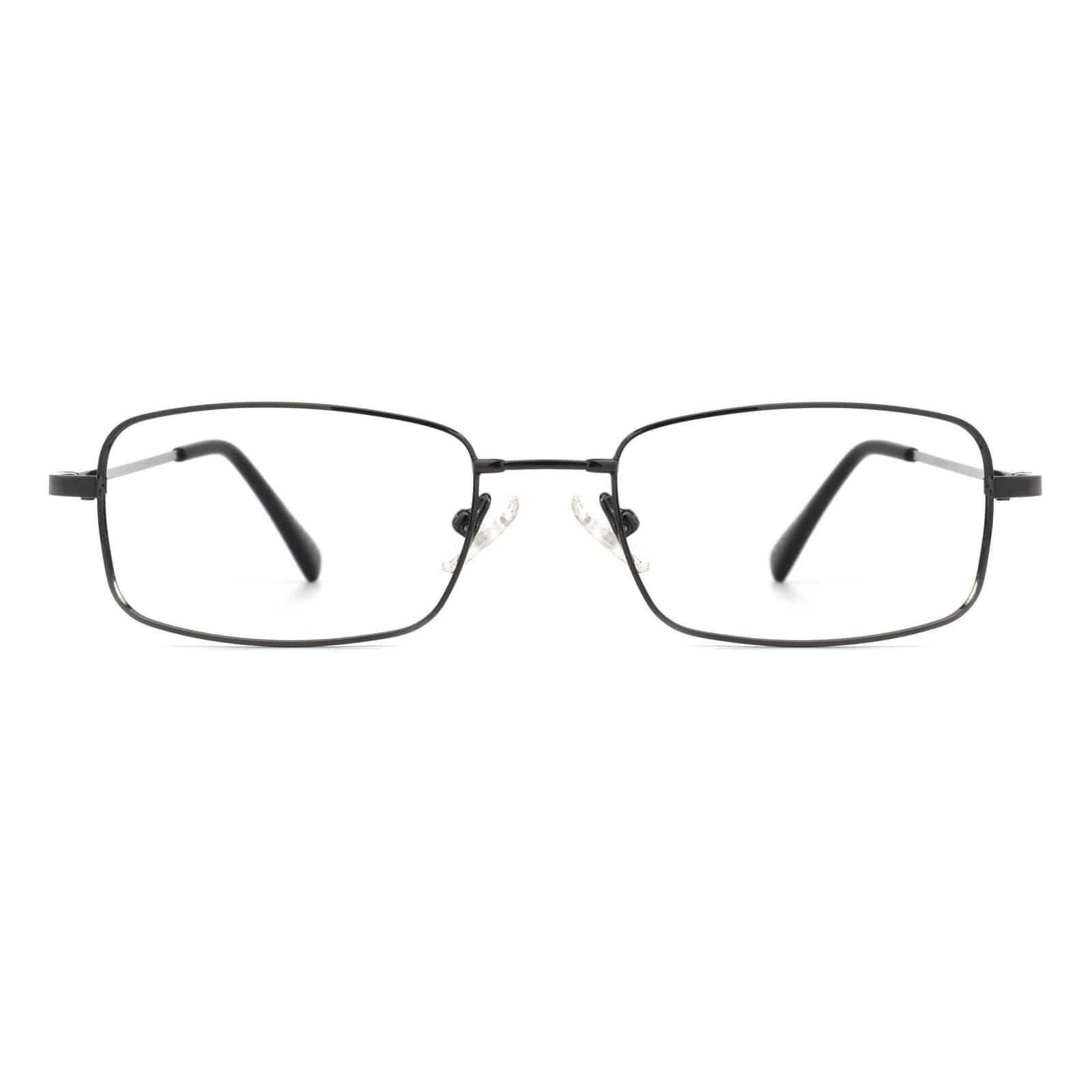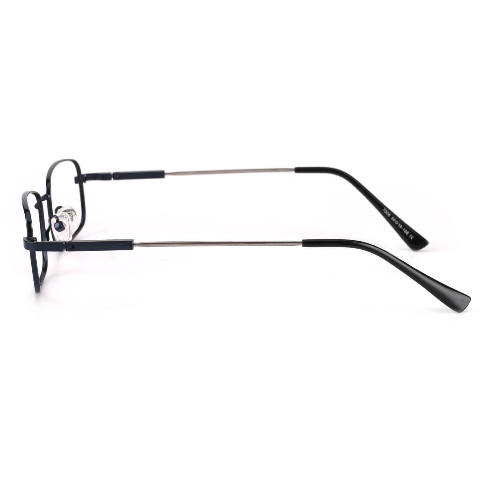 A men's style rimless memory titanium frame with silicone temple tips.Sometimes clean and simple is the best way to go. as shown with these elegant eyeglass frames for women and men. The full-rim. metal-alloy. rectangular design features stainless steel temple arms and silicone nose pads for a comfortable fit. These frames come in six color options: gold. black and gun.