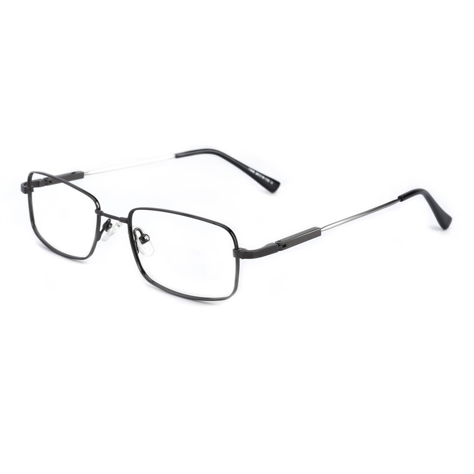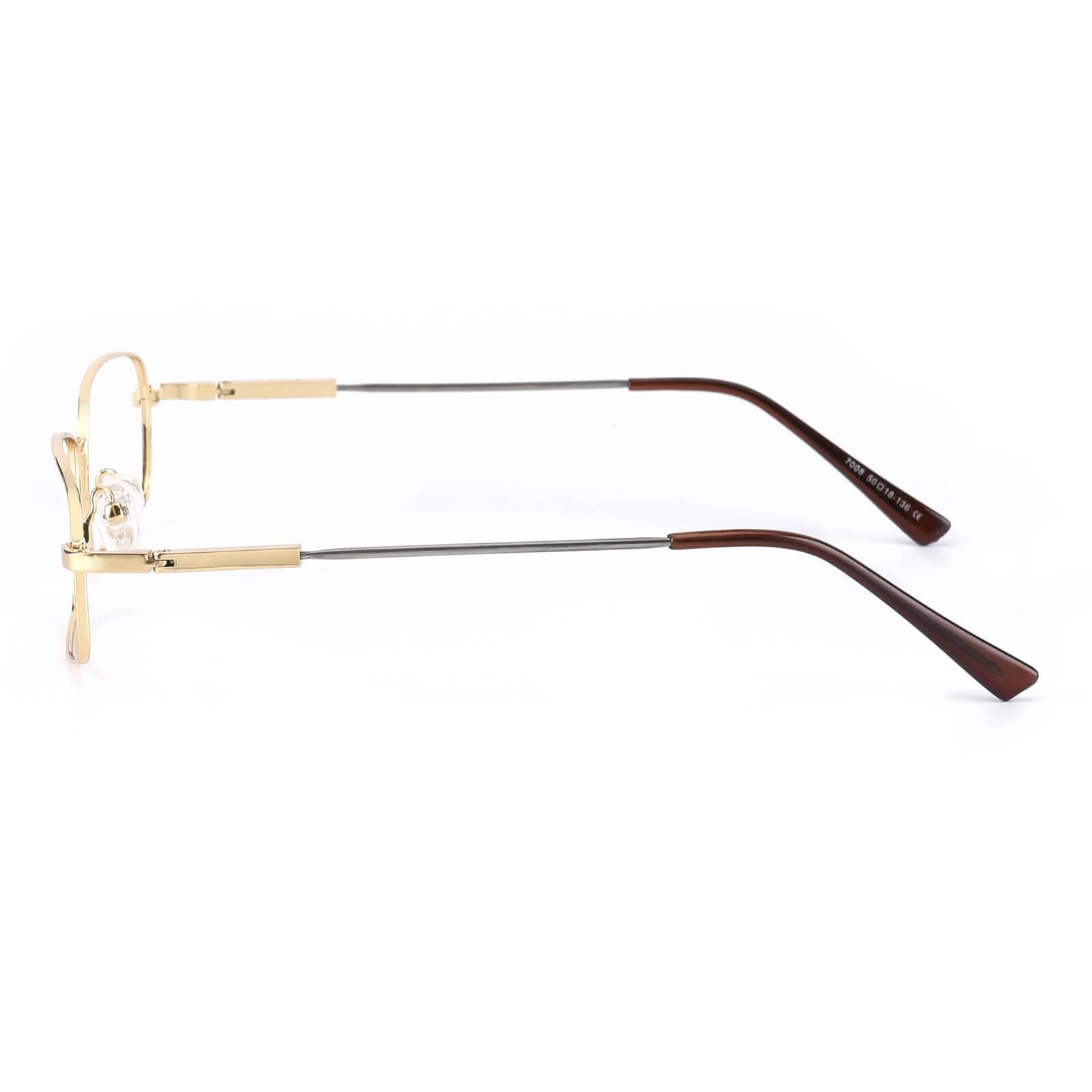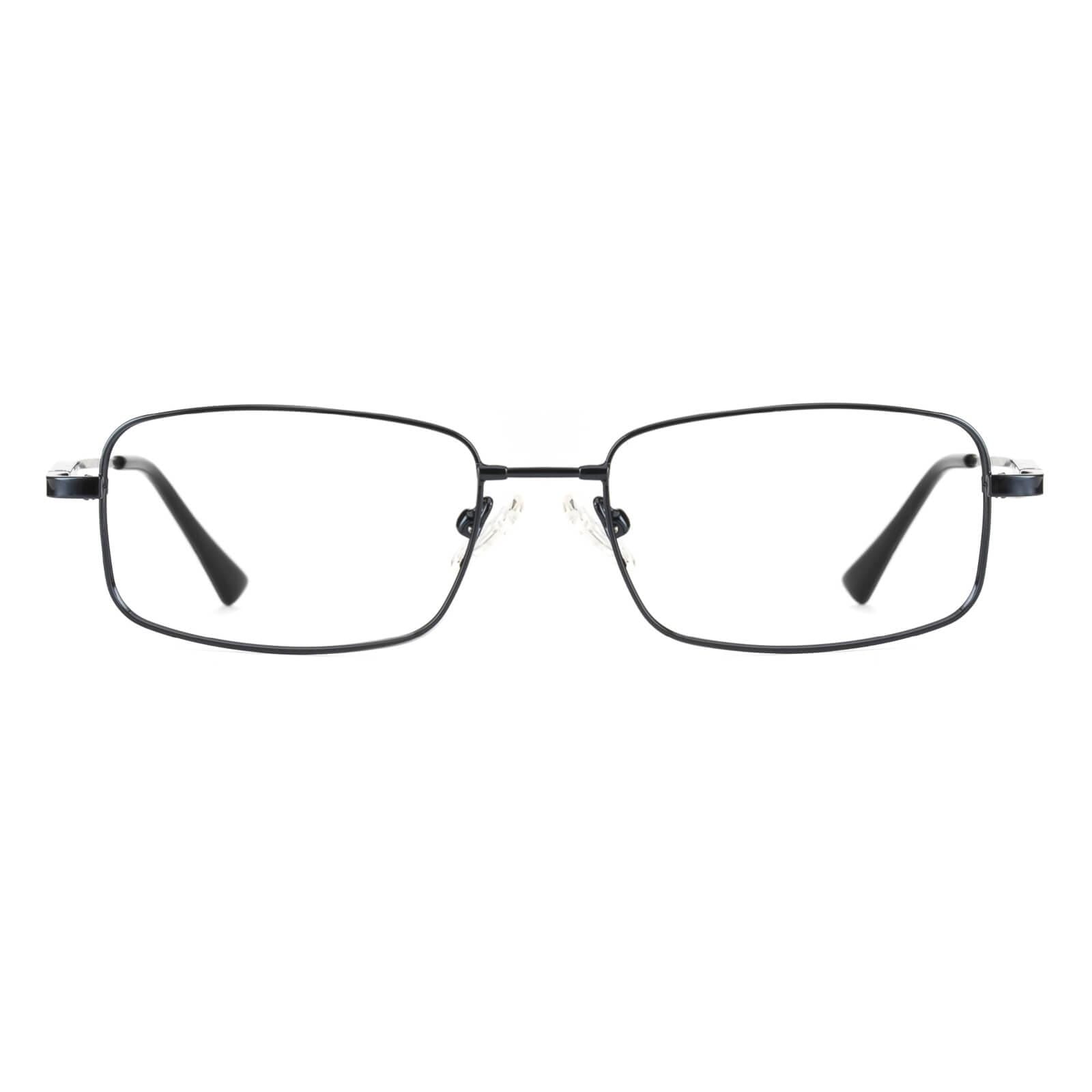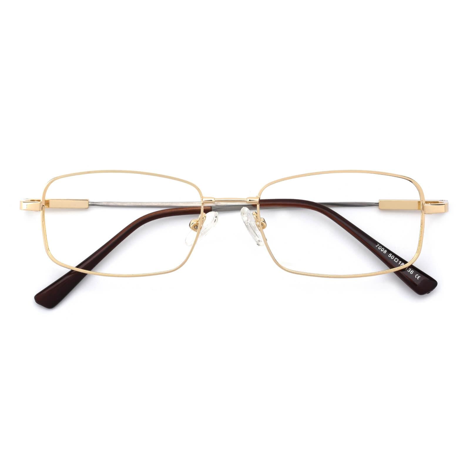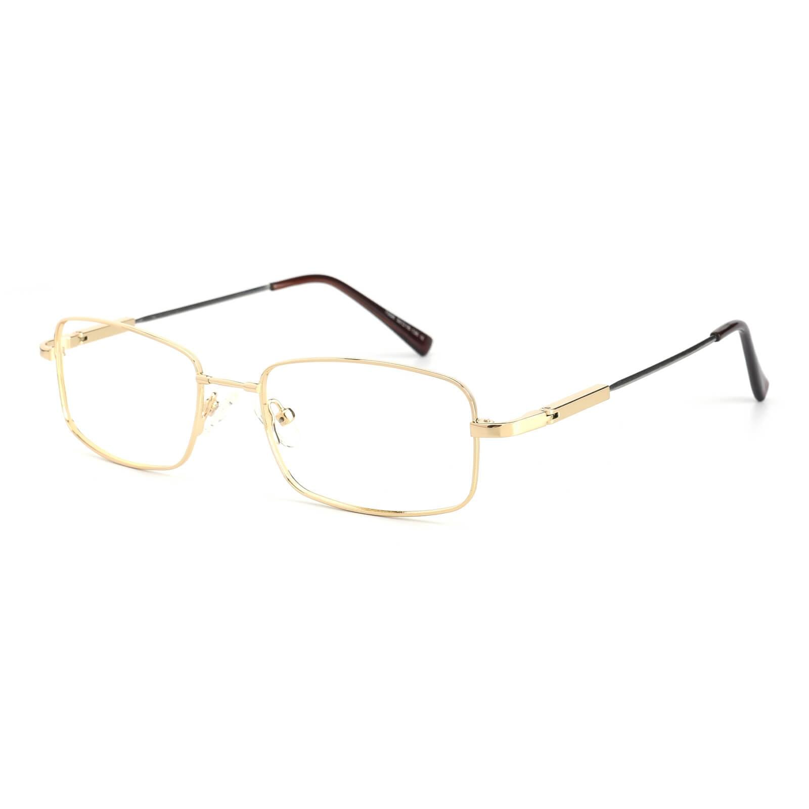 A men's style rimless memory titanium frame with silicone temple tips.Sometimes clean and simple is the best way to go. as shown with these elegant eyeglass frames for women and men. The full-rim. metal-alloy. rectangular design features stainless steel temple arms and silicone nose pads for a comfortable fit. These frames come in six color options: gold. black and gun.