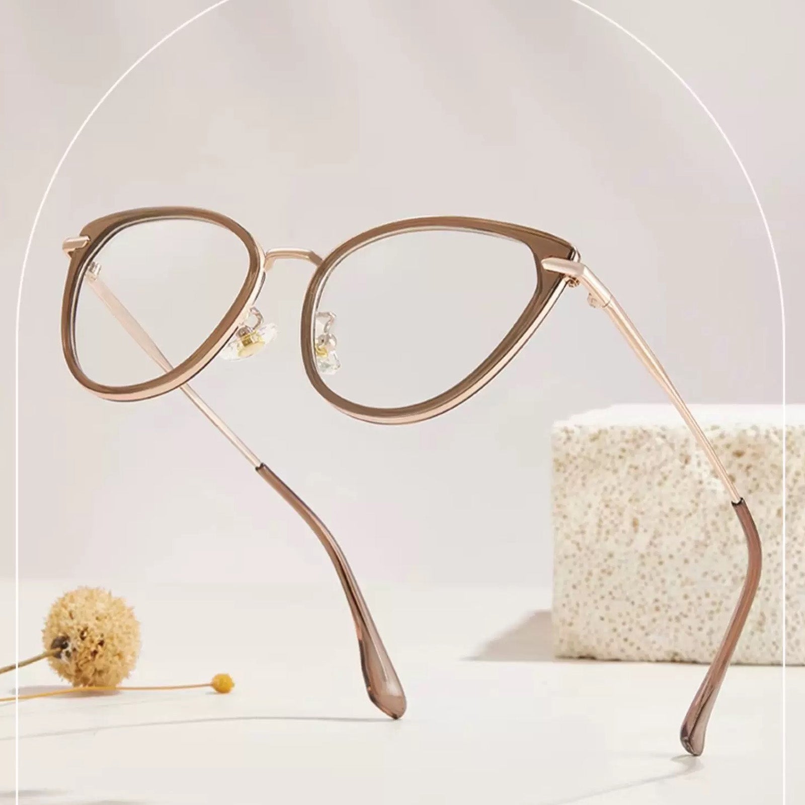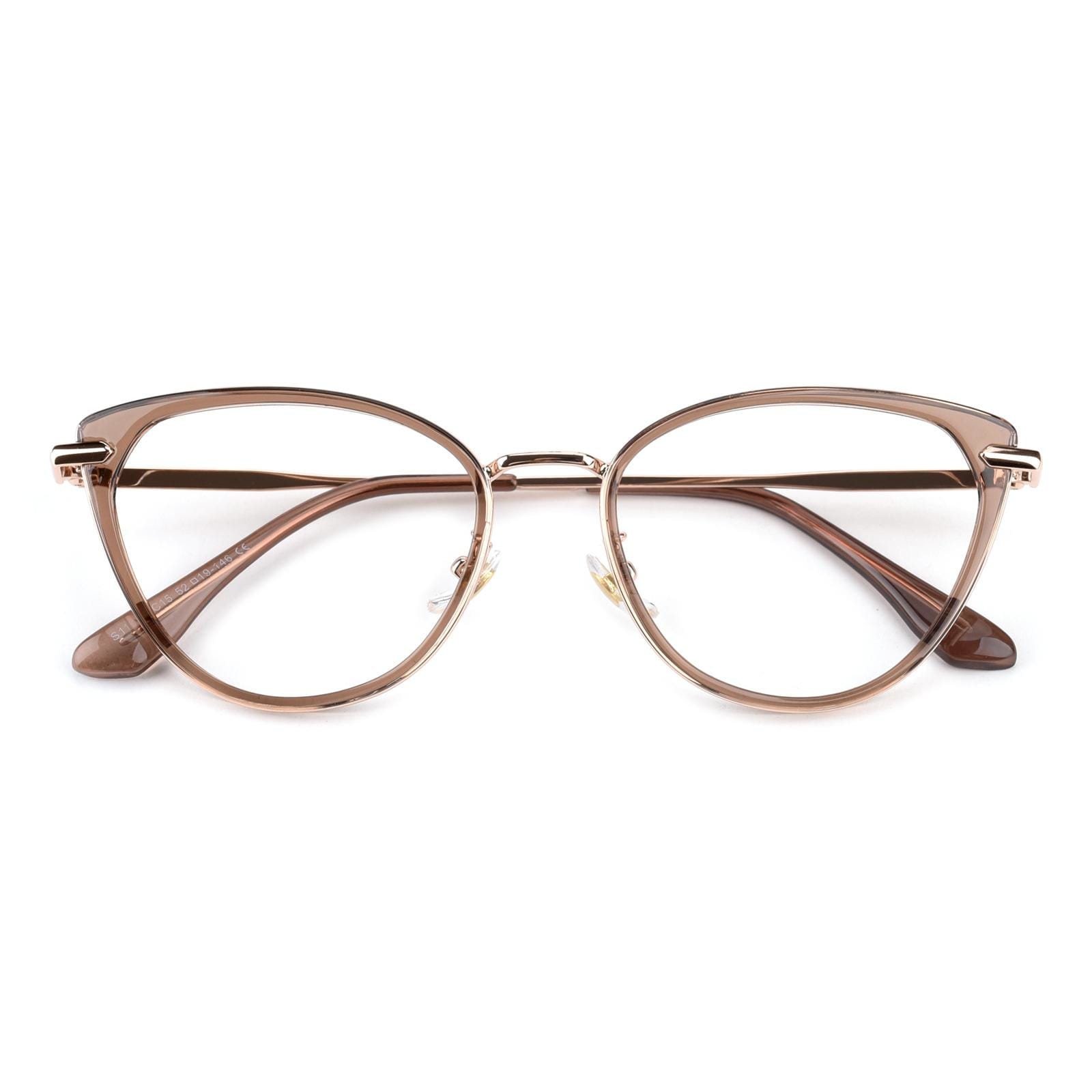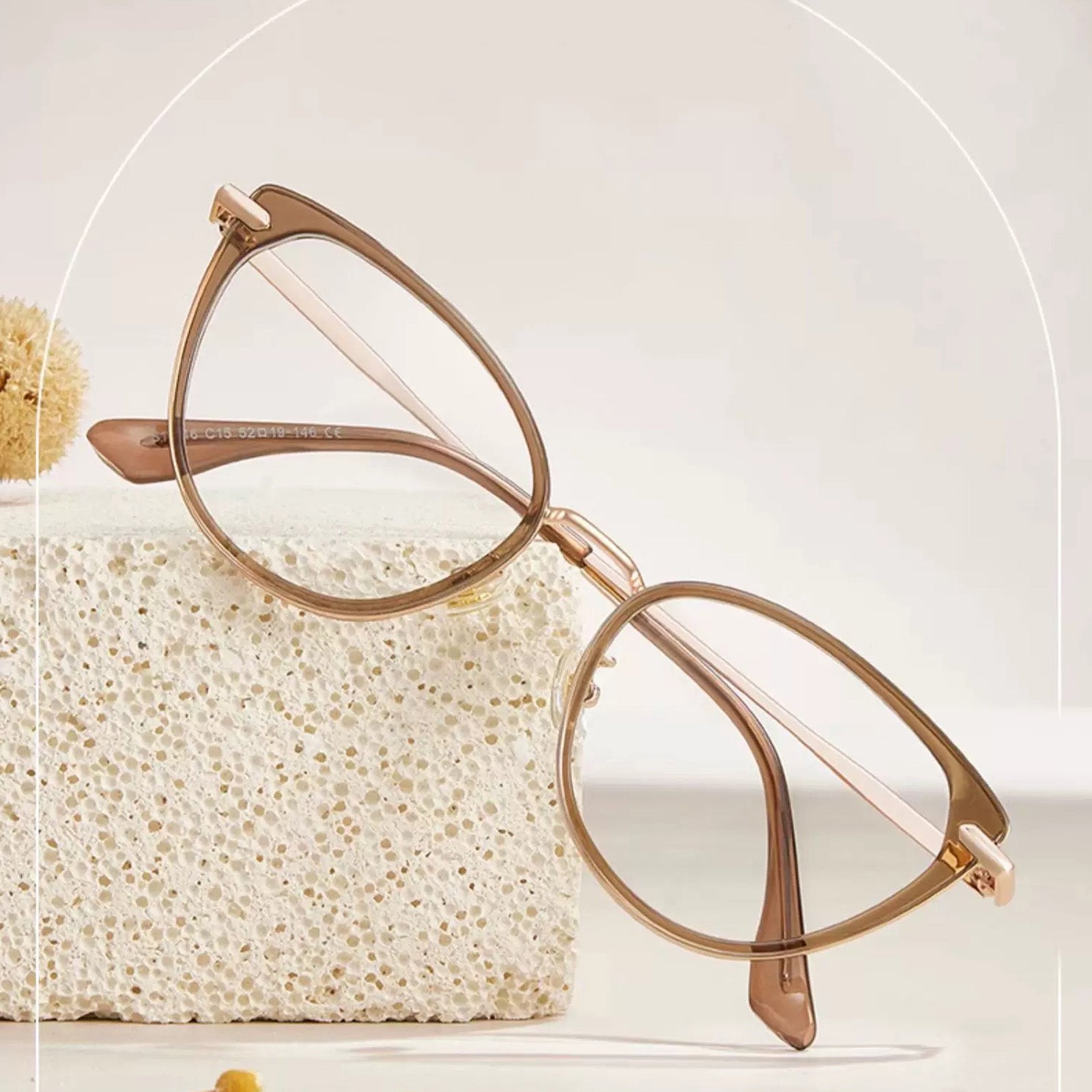 Embrace a touch of ethereal allure with our captivating semi-transparent cat-eye glasses. These enchanting frames feature a delicate balance of sophistication and playfulness. The cat-eye shape lends a hint of vintage elegance. while the semi-transparent design adds a subtle and intriguing charm. With the addition of a comfortable nose pad. these glasses provide a perfect fit for all-day wear. Step into a world of timeless style and let your unique personality shine with these mesmerizing cat-eye glasses.