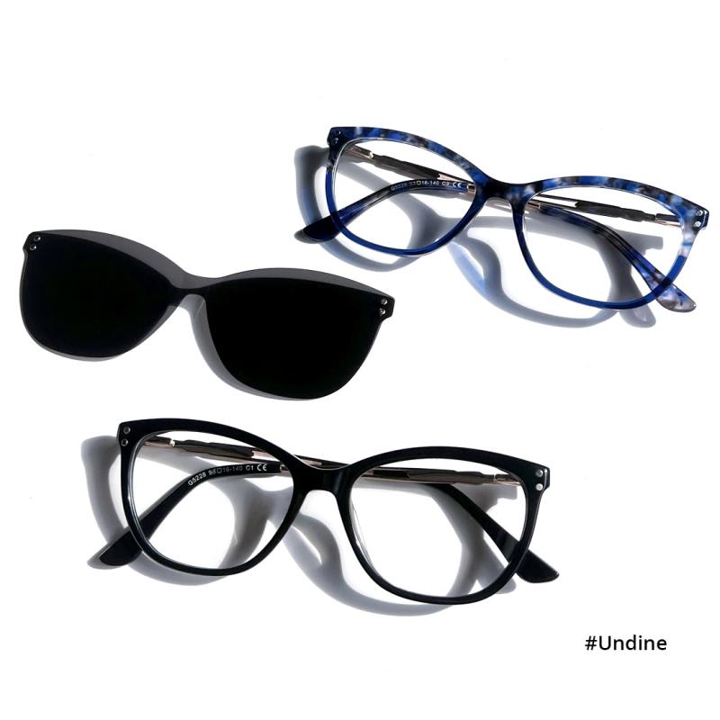 Undine is a clip on glasses. The glasses with spring legs provide a comfortable wearing experience and can be worn as sunglasses with clip on.